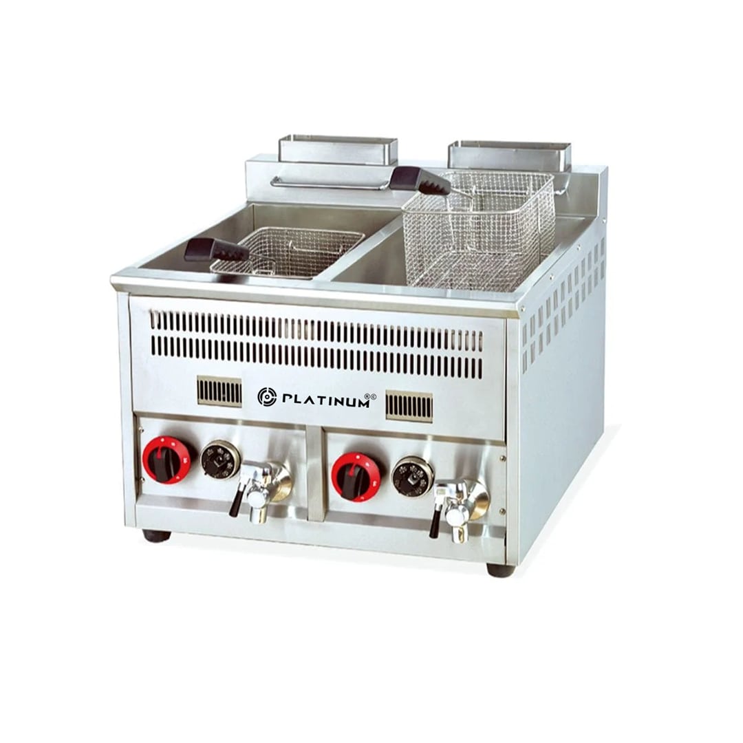 The Platinum Flour Mill 2 Tank 2 Basket Gas Deep Fryer with 16+16 liter capacity is a commercial-grade fryer designed for restaurants, hotels, catering services, cafés, and large-scale food outlets. With two separate tanks and baskets, it allows simultaneous frying of different foods, including French fries, chicken, fish, nuggets, samosas, and snacks, improving kitchen efficiency and output.