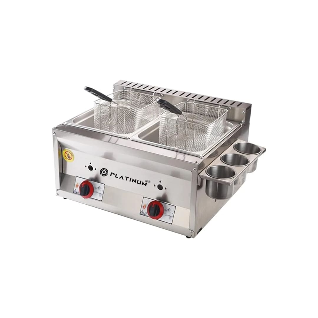 The Platinum Flour Mill 2 Tank 2 Basket Gas Deep Fryer, with a capacity of 6+6 liters, is a professional-grade fryer designed for restaurants, hotels, cafés, food stalls, and catering units that require large-volume frying. With two separate tanks and baskets, this fryer enables the simultaneous cooking of various foods, including French fries, nuggets, chicken, fish, samosas, and snacks, ensuring faster service and consistent results.